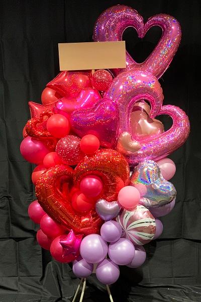 真っ赤なバルーンにピンクとラベンダーをプラスし、目を引くゴージャスさと優しい印象を両立させたバルーンスタンドです。「愛情」を表す赤やピンクのハートに、「あなたが好きです」の意味を持つキャンディーモチーフを加えたデザインは、婚約や結婚のお祝いにぴったりです。