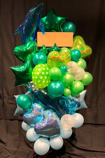 水色や黄緑色、緑色のバルーンを使用し、グラデーションで海をイメージしたバルーンスタンドです。青いイルカを添えることで、海を泳ぐ姿を表現しています。