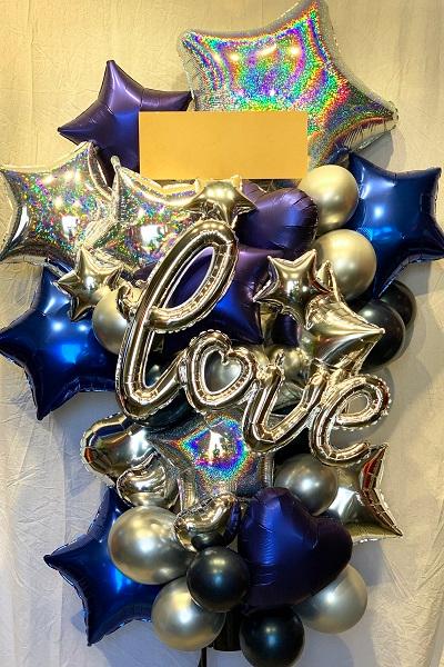 シルバーと濃いブルーの大人っぽい雰囲気を持つバルーンスタンドです。「Love」の文字入りで愛情を表現しており、アーティストの公演やホワイトデー、バレンタインのイベントなど、さまざまなシーンにおすすめです。