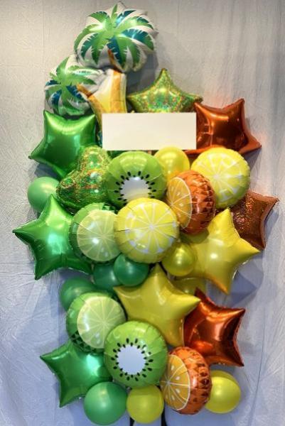 ビタミンカラーのグラデーションが美しい、ボリュームのあるバルーンスタンドです。グリーンやイエロー、オレンジの3色で縦のグラデーションを楽しめ、星やフルーツ、ヤシの木のバルーンを使用した「南国」や「夏」を感じさせるデザインです。