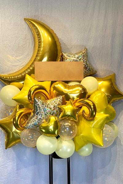 イエローとゴールドを基調とした華やかなバルーンスタンドは、グリッターやクリアバルーンの組み合わせにより、ゴージャスかつ柔らかな印象を与えます。飾ることで元気を与える空間へと仕上げることができ、見た方の気持ちをポジティブにさせてくれるでしょう。