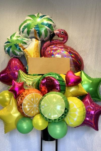 南国気分を味わえるトロピカルなバルーンスタンドです。ビタミンカラーのバルーンにヤシの木とフラミンゴが映える、明るくカラフルなデザインが特徴です。
