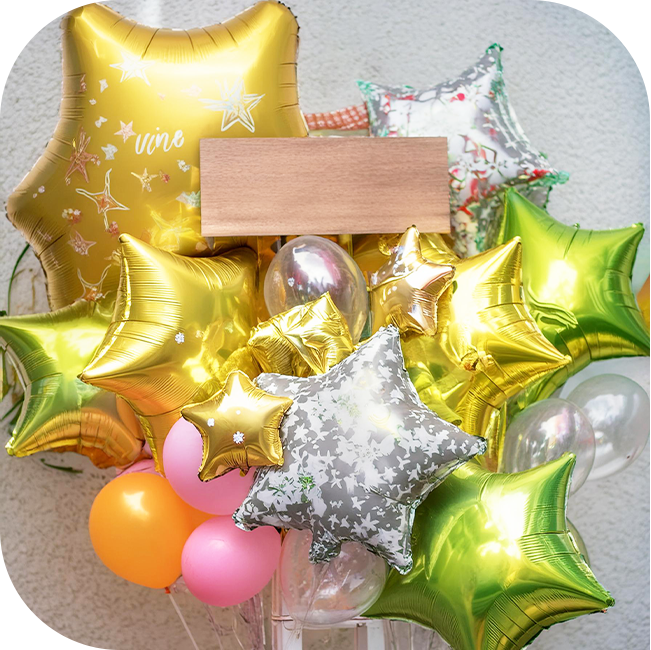 たとえば、広い会場なら大き目のバルーンスタンドや複数のバルーンでまとめたバルーンギフト、狭い会場ならコンパクトなブーケタイプや小さめのスタンドタイプなど、状況を考慮してサイズを選ぶと良いでしょう。