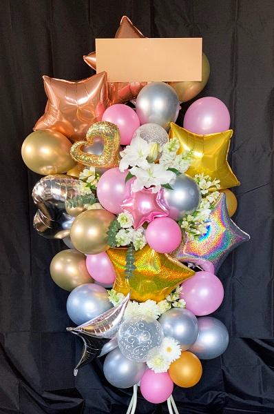 ピンクやゴールド、シルバーのバルーンと白い花を組み合わせたゴージャスなバルーンスタンド花です。淡い色合いとゴールドの組み合わせがガーリーな見た目に仕上げており、アーティストのお祝いや女性向けのお店の装飾にぴったりです。