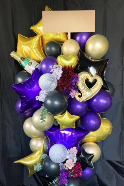 生花を取り入れつつブラックとパープルのダークカラーで仕上げたクールでスタイリッシュなバルーンスタンド花です。ゴールドのバルーンを差し色として使うことで、シックかつ華やかな雰囲気を演出しています。
