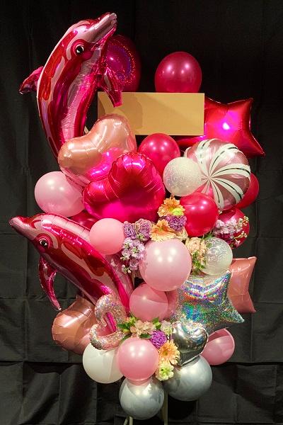 ピンクを基調としたカラフルな2段のバルーンスタンド花です。ピンク色のイルカのバルーンが目を引く特徴的なデザインで、ハートや星型のバルーンと生花をバランス良く組み合わせることで豪華さを演出しています。